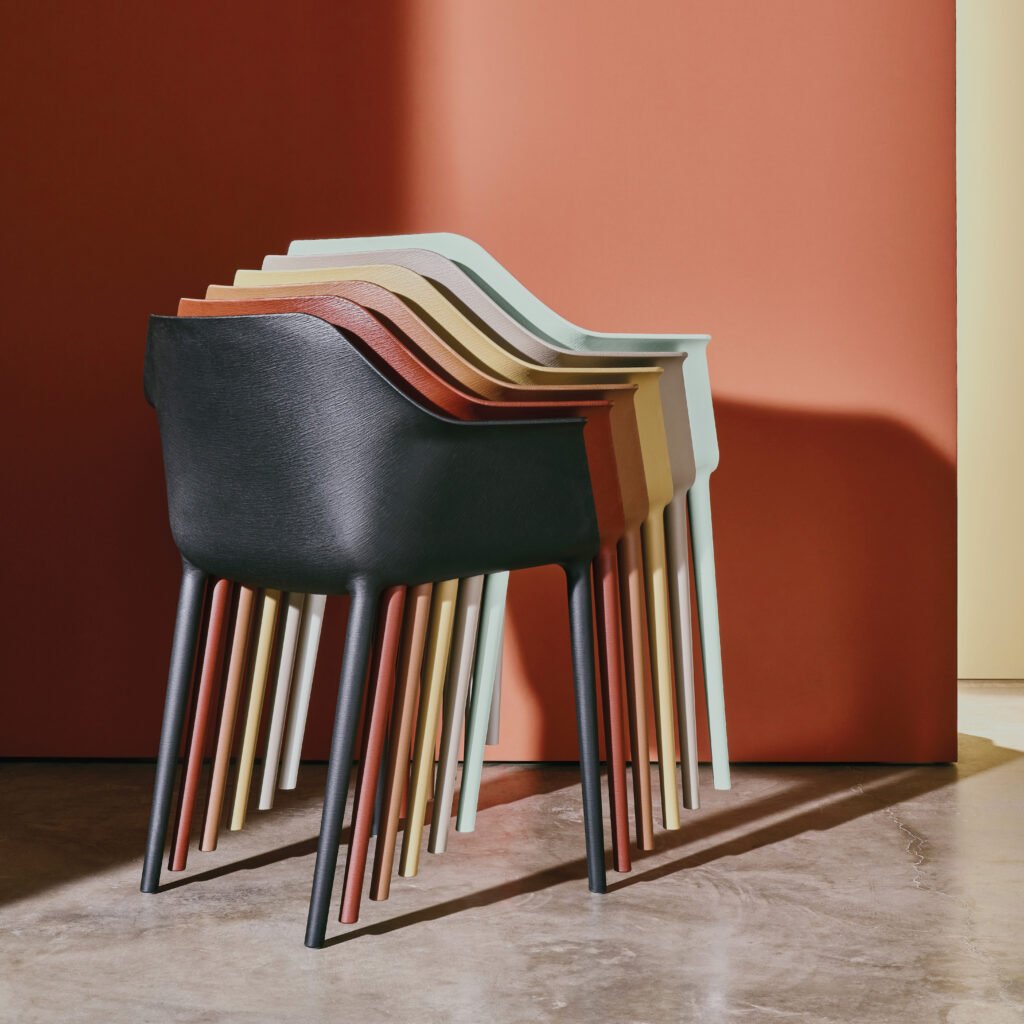 The surface of Andreu World’s Gala Pure Eco Chair bends and dips to form an ultrathin, highly ergonomic chair. Designed by Piergiorgio Cazzaniga, the chair was made using gas-assisted, advanced injection technology on 100 percent recycled and recyclable thermopolymers. Biophilic in aesthetic, the shell surface is etched with a wood-inspired vegetable finish for a sensory experience suggestive of the resource it is saving.