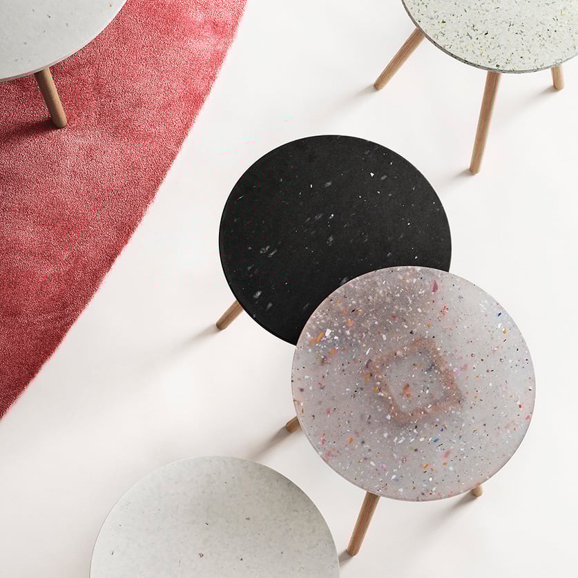 Equal parts chic and cheeky, Scandinavian Spaces’ contract furniture line has expanded its Tinnef occasional table series to include dining height options, and its 100 percent recycled plastic top in four new contemporized colorways and dazzling one-of-a-kind patterns. The saccharine hues from cosmetics packaging, reflective foil from yogurt containers, linework from barcodes, and typography from labels imbue the table with unique human lore as they conspire to create beguiling surfaces that are fun, utilitarian, and durable for high-traffic interiors.