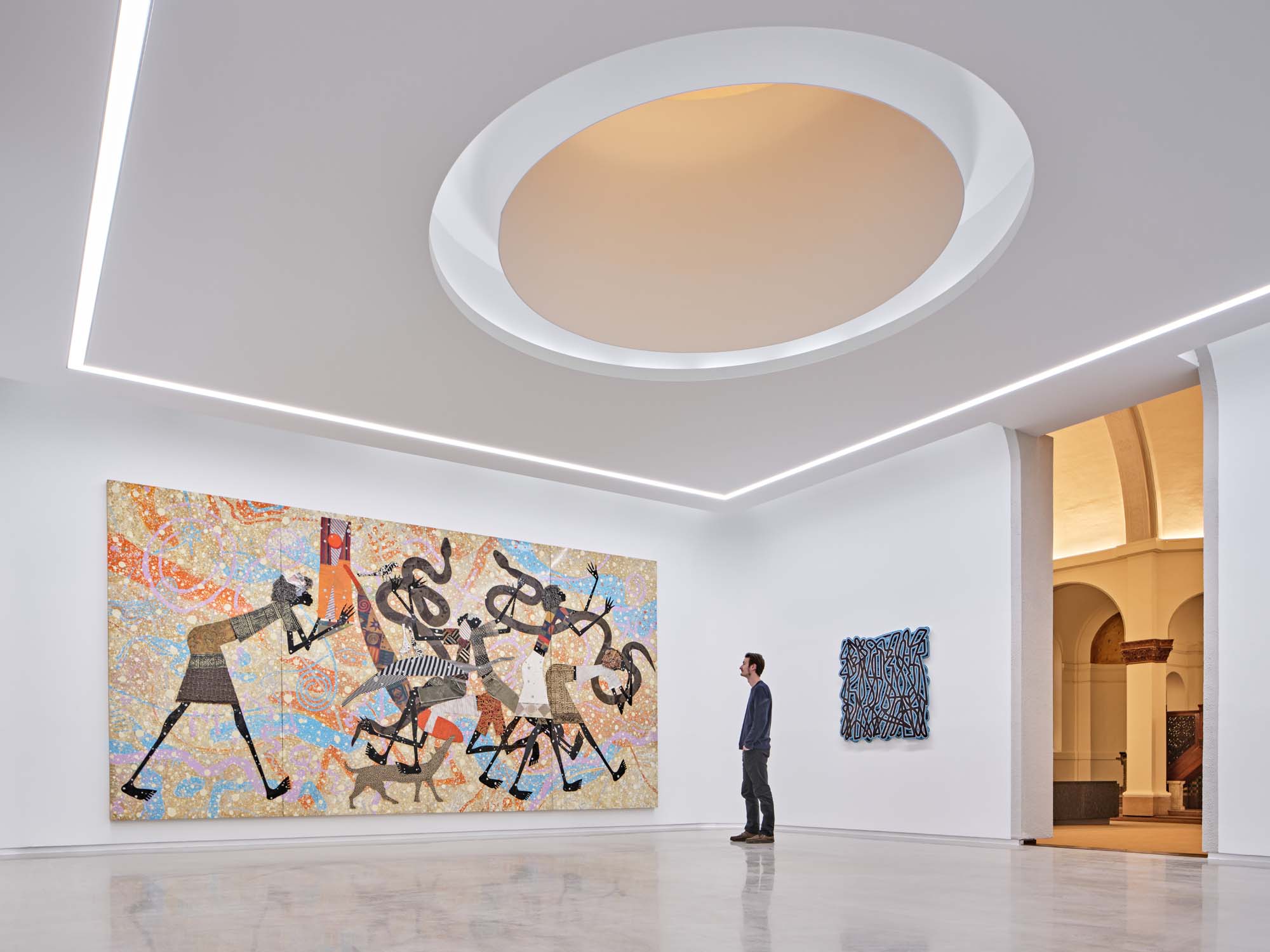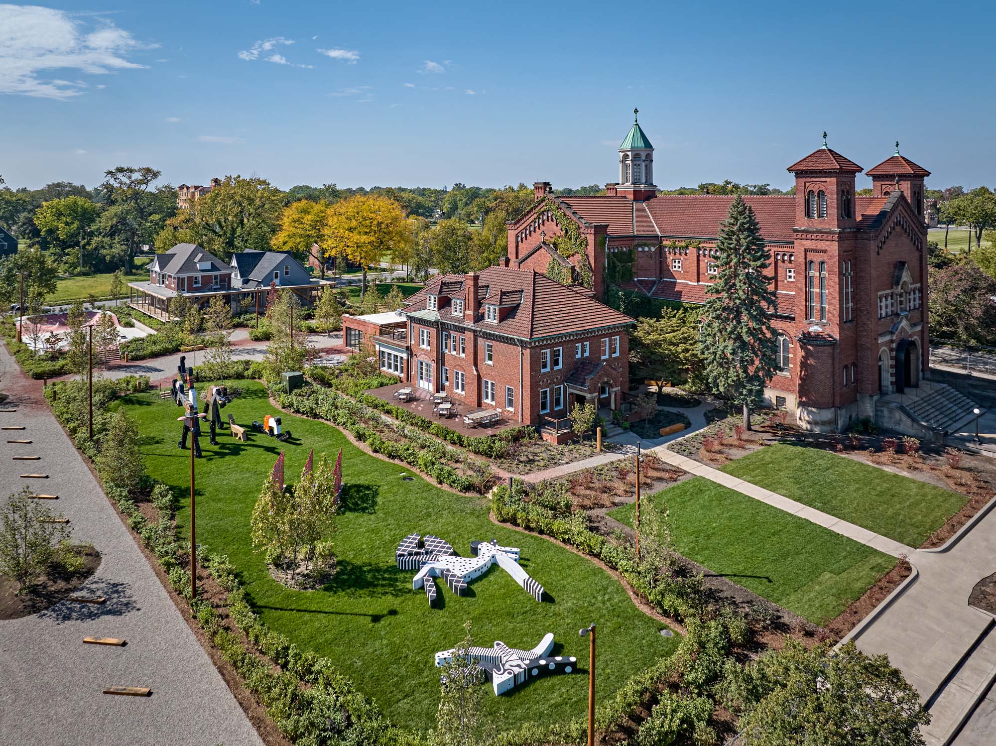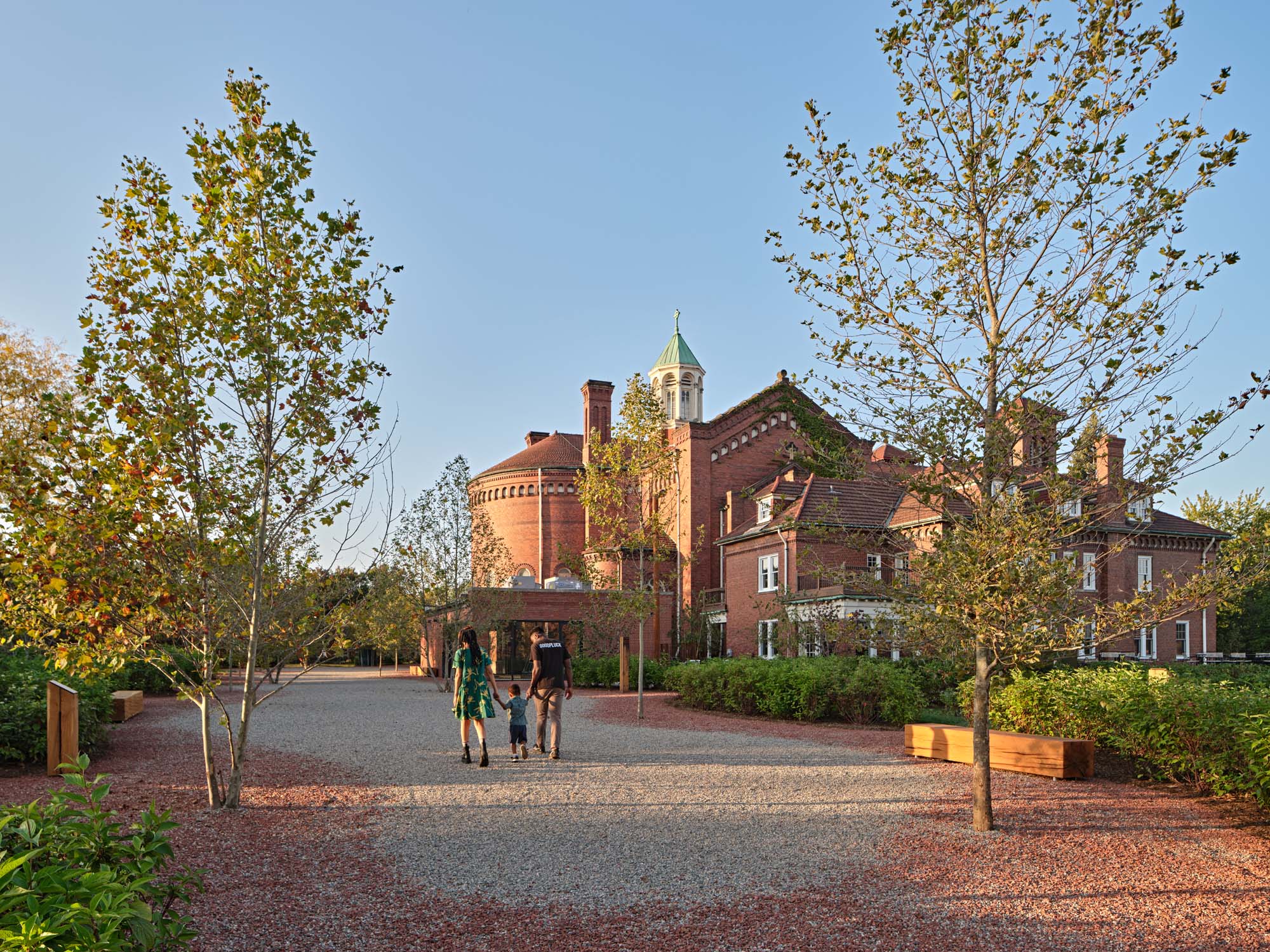 The splendidly restored church, with its twin turrets, detailed red brickwork, and banded white ornament, now exudes the old-world grace of an earlier era. Inside, it contains a completely new program: glowing, white gallery spaces, high-ceilinged performance areas, and the Little Village Library, a collection of monographs, catalogues, and research materials centered on people of color, occupying the church’s south transept (and, in part, its former confessionals). Outside the edifice is now ringed by reused buildings—including the former rectory housing reimagined as ALEO, a bed-and-breakfast (and the headquarters of artist McArthur Binion’s BIPOC artist–supporting Modern Ancient Brown Foundation), and two former homes now hosting culinary arts spaces, including a new pâtisserie—as well as a layered landscape that consists of a sculpture garden dedicated to the work of legendary local artist Charles McGee, a Tony Hawk-designed skatepark, and discreet areas for lounging, escaping, or enjoying public art.
