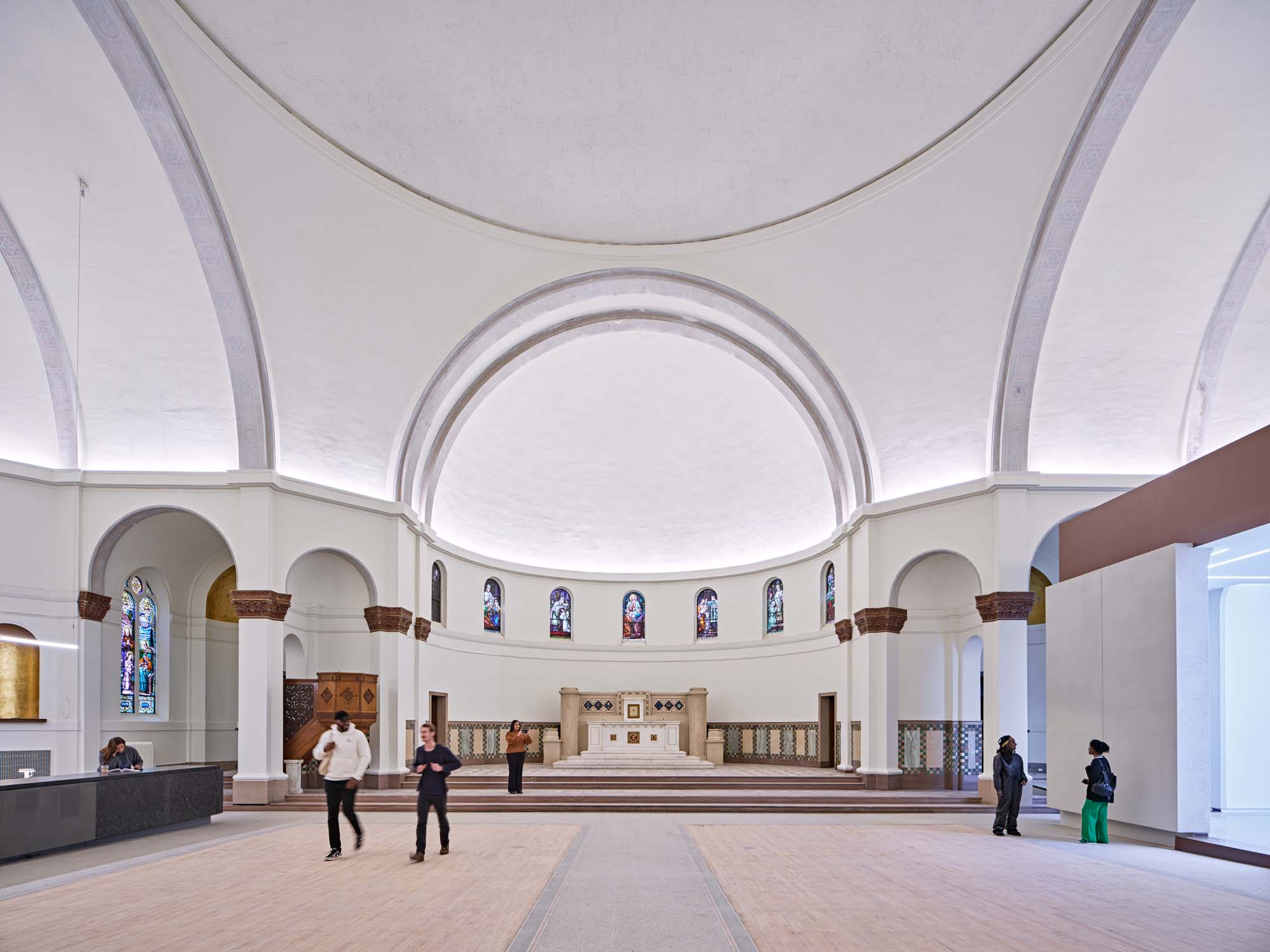 The Curises’ impressive design team, a mix of local and non-local talent, has struck a creative balance between respectful preservation and energetic insertion—a dialogue between old and new that foregrounds historic craft and story while charting a creative, community-centered future. Inside the Shepherd’s restored shell, Brooklyn-based Peterson Rich Office have installed two white gallery boxes (one in the church’s nave, and another in its north transept), whose texture and heft give them singular, rooted presences while nodding to (and not overshadowing) the robust ecclesiastical forms around them. The cubes’ rust-hued top edges talk to the height and color of existing column capitals. A new torqued stair channels the curvature of an arched window. Cove lighting accentuates historical arches, vaults, and (subtly whitewashed) bands of decoration while leading you toward mysterious new forms.